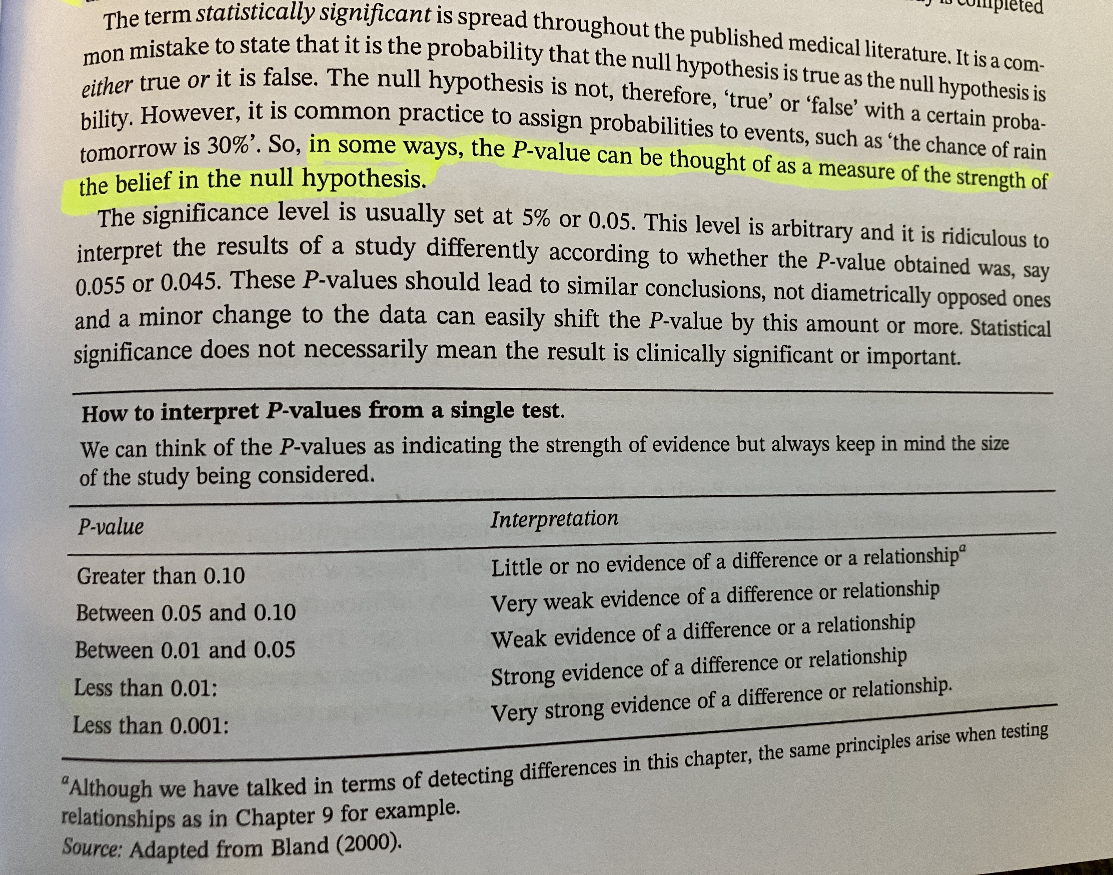 On the other hand, I know that smarter and more well-read people than I disagree on how straightforward this interpretation is. The textbook we used in my PhD-level course in medical statistics7 contain a table that tells us to do that: