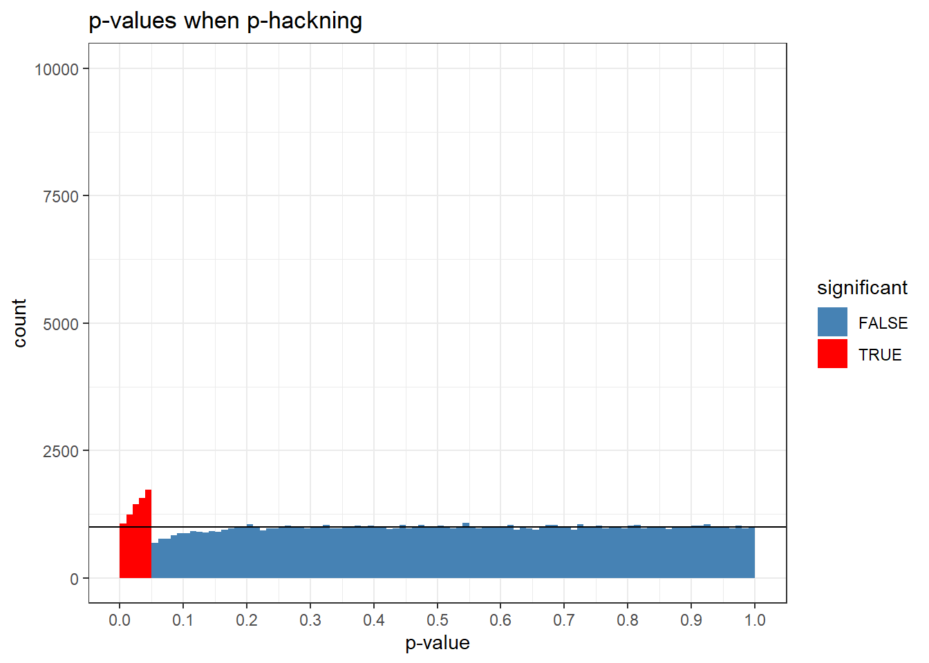p_vector <-c() #empty vectorfor(i in1:100000){ A <-rnorm(100, 0, 1) #normally distributed data from a group B <-rnorm(100, 0, 1) #another group with same meanif(t.test(A,B)$p.value >0.05){ A <-append(A, rnorm(20, 0, 1)) B <-append(B, rnorm(20, 0, 1)) } p_vector[i] <-t.test(A,B)$p.value}d <-data.frame(p_vector, significant = (p_vector <0.05))ggplot(d, aes(x = p_vector, fill = significant)) +geom_histogram(breaks =seq(0,1, length.out =101), color =NA) +geom_hline(yintercept =100000/100) +scale_fill_manual(values =c("FALSE"="steelblue", "TRUE"="red")) +scale_x_continuous(breaks =seq(0,1, by =0.1)) +labs(title ="p-values when p-hackning", x ="p-value", y ="count") +theme_bw() +ylim(0,10000)