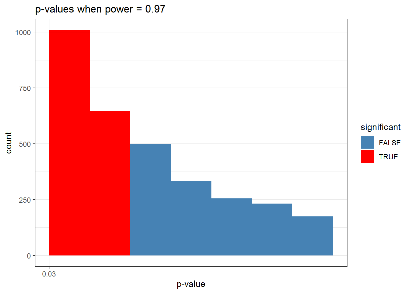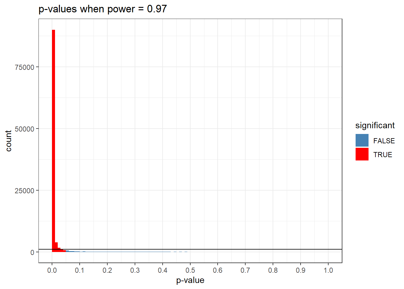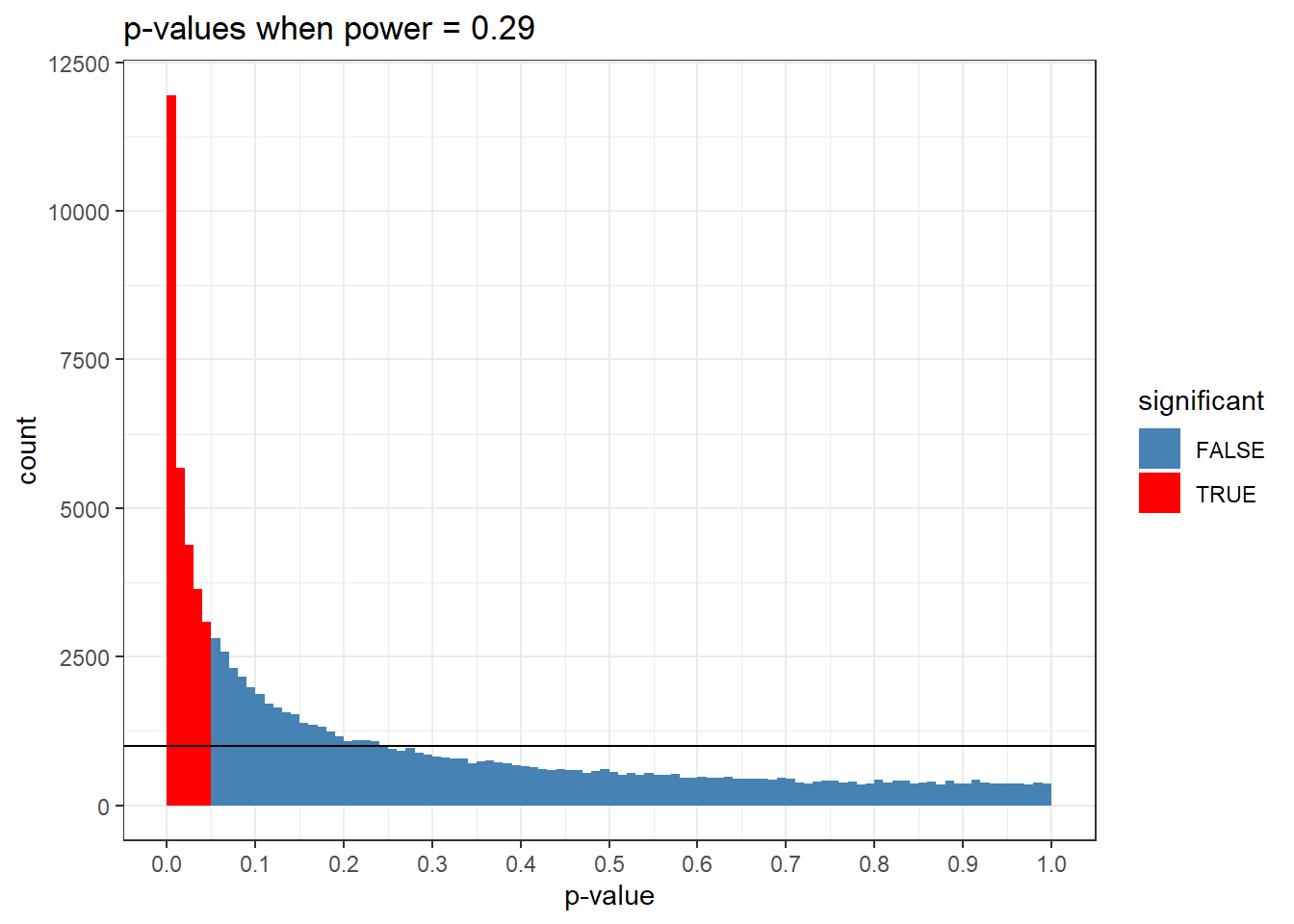 d <-subset(d, p_vector >0.03& p_vector <0.1)ggplot(d, aes(x = p_vector, fill = significant)) +geom_histogram(breaks =seq(0.03,0.1, length.out =8), color =NA) +geom_hline(yintercept =100000/100) +scale_fill_manual(values =c("FALSE"="steelblue", "TRUE"="red")) +scale_x_continuous(breaks =seq(0.03,0.1, by =0.1)) +labs(title =paste("p-values when power =",round(sum(p_vector <0.05)/100000, 2)), x ="p-value", y ="count") +theme_bw() #+ ylim(0,10000)